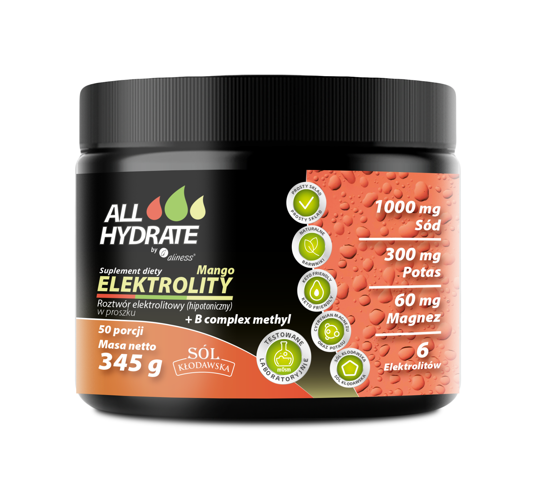 Roztwór elektrolitowy w proszku ALLHydrate, Elektrolity + B Complex Methyl o smaku mango Zero cukru,Zero kalorii,10 witamin z grupy B,KETO