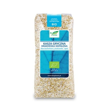 Kasza gryczana niepalona krakowska jest świetnym źródłem białka, jest to białko lepiej przyswajalne niż to pochodzące ze zbóż, ma podobną wartość jak białko roślin strączkowych (fasola, groch, soja) i jest bogate w unikatowe aminokwasy – lizynę i tryptofan, których nasz organizm sam nie wytwarza. Bogactwo kaszy gryczanej krakowskiej niepalonej bio to witaminy – E, B1, B2, P i PP, które są dobre dla układu nerwowego oraz znaczna ilość soli mineralnych, takich jak wapń, fosfor, magnez, które podnoszą odporność, a także żelazo, nikiel, kobalt, miedź, cynk, bor,jod oraz potas który obniża ciśnienie krwi, dlatego jest wskazana dla osób borykających się z nadciśnieniem. Kasza gryczana krakowska niepalona bio posiada właściwości odkwaszające nasz organizm, ma znacznie więcej błonnika pokarmowego. W przybliżeniu jest to 2 razy większa ilość w porównaniu do ryżu czy makaronów – w 100g kaszy znajduje się około 6g błonnika. Kaszę gryczaną krakowską niepaloną bio poleca się osobom z zaburzeniami pracy jelit oraz na diecie redukcyjnej. Kasza gryczana krakowska niepalona bio dzięki temu na dłużej zapewnia nam uczucie sytości, a stopniowo uwalniana skrobia jest długotrwałym źródłem energii. Jednocześnie jest wskazana również dla osób z podwyższoną zawartością cholesterolu we krwi, ponieważ jednym z dobroczynnych działań błonnika jest obniżanie jego stężenia w ustroju. Pomaga w niedokrwistości przez dużą zawartość witaminy E, kwasu foliowego i żelaza. Dzięki temu wskazana jest w przypadku obfitych miesiączek oraz u osób z możliwą anemią. Nie zawiera glutenu. Może być więc stosowana przez osoby chore na celiakię oraz z problemami jelitowymi wywołanymi spowolnionym metabolizmem.