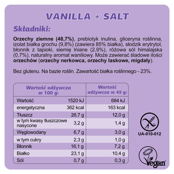 Orzechy ziemne (48,7%), prebiotyk inulina, gliceryna roślinna, izolat białka grochu (9,8%) (zawiera 85% białka), słodzik erytrytol, błonnik z tapioki, siemię lniane (2,9%), różowa sól himalajska (0,7%), naturalny aromat waniliowy. Może zawierać śladowe ilości orzechów (orzechy nerkowca, orzechy laskowe, migdały).