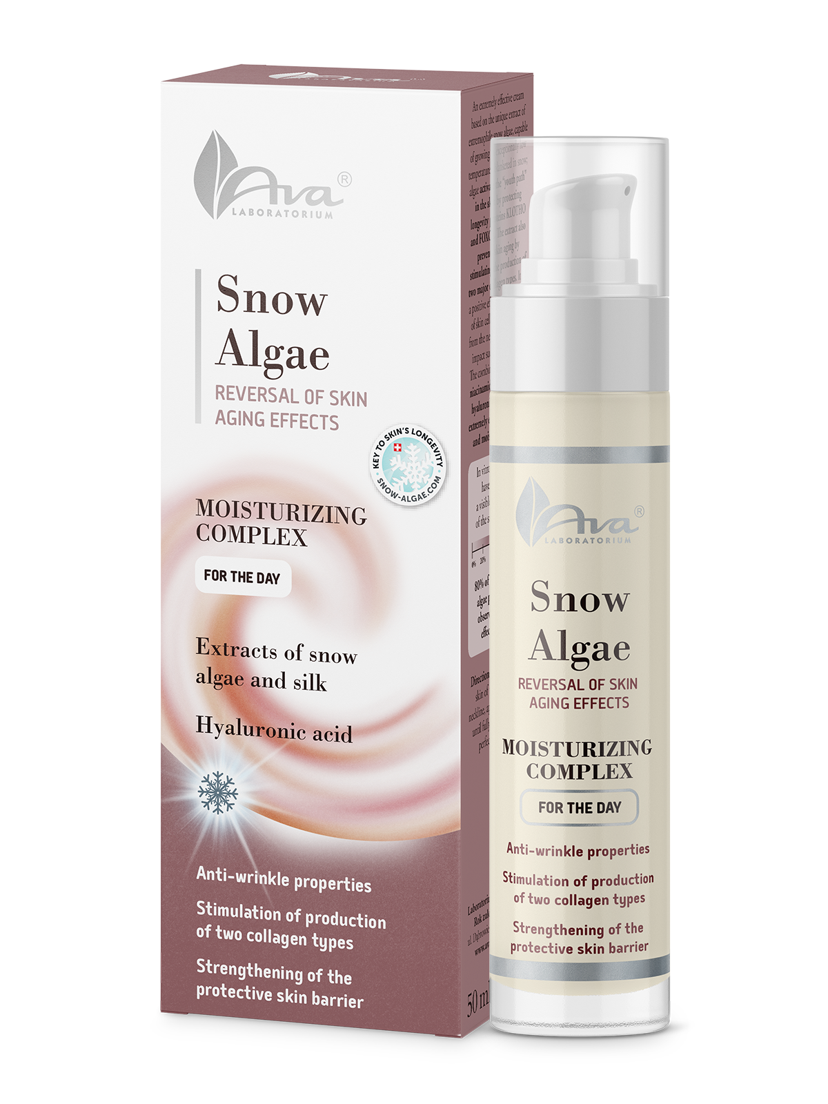 Kompleks nawilżający na dzień korzystnie działa na kondycję komórek skóry oraz osłania je przed niepożądanym wpływem czynników środowiska m.in. promieniowaniem UV. Działanie przeciwzmarszczkowe i intensywnie nawilżające zawdzięcza połączeniu śnieżnej algi z niacynamidem, proteinami jedwabiu oraz kwasu hialuronowego.